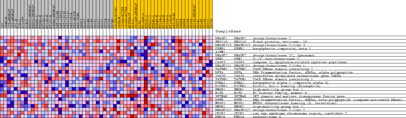 | 6 | DNASE2 | DNASE2 Entrez,  Source | deoxyribonuclease II, lysosomal | 11255 | 0.014 | -0.3945 | No |