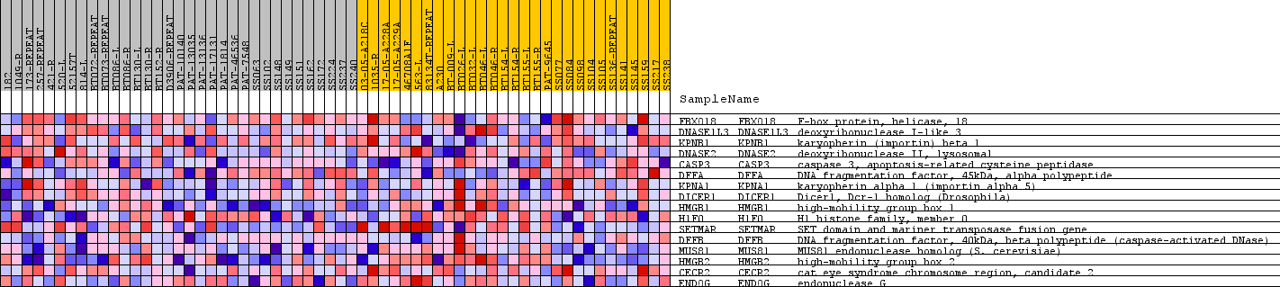 | 12 | DFFB | DFFB Entrez,  Source | DNA fragmentation factor, 40kDa, beta polypeptide (caspase-activated DNase) | 18329 | -0.056 | -0.4402 | Yes |