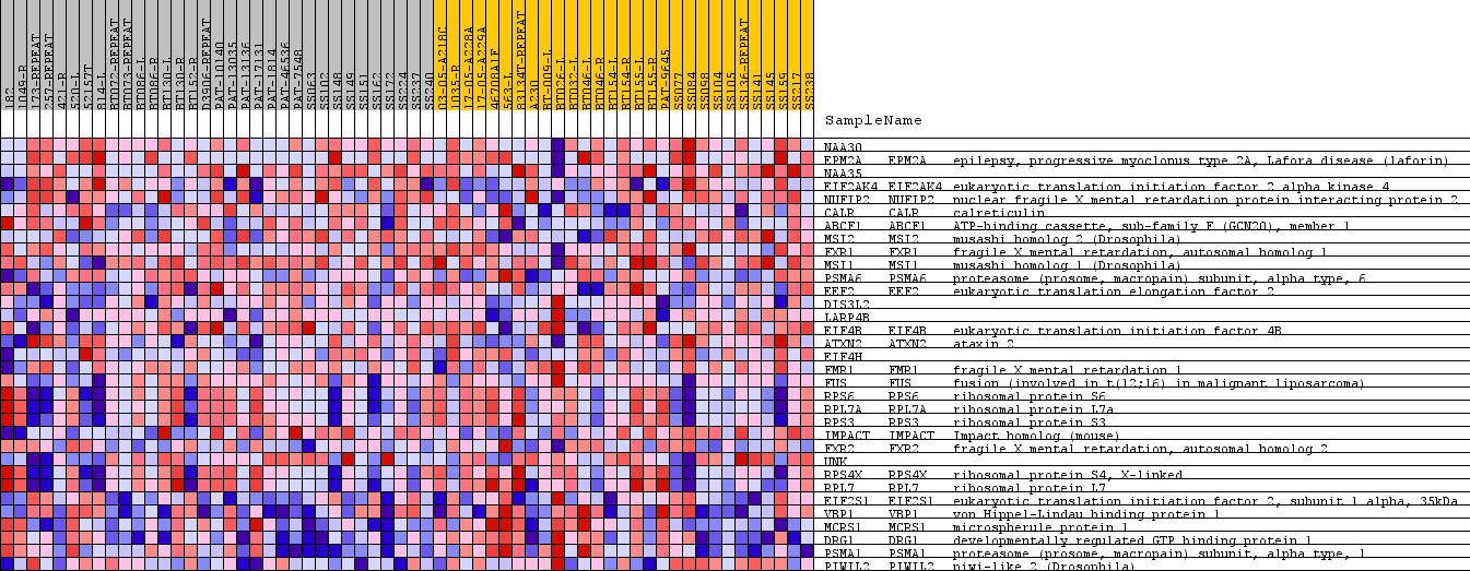 | 18 | FMR1 | FMR1 Entrez,  Source | fragile X mental retardation 1 | 14572 | -0.015 | -0.3325 | Yes |