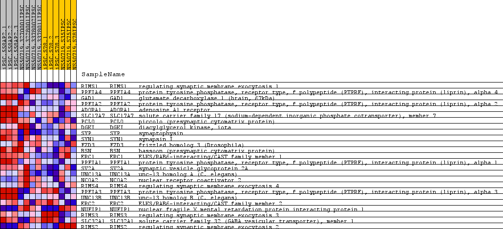 | 1 | RIMS1 | RIMS1 Entrez,  Source | regulating synaptic membrane exocytosis 1 | 119 | 0.857 | 0.1771 | Yes |
