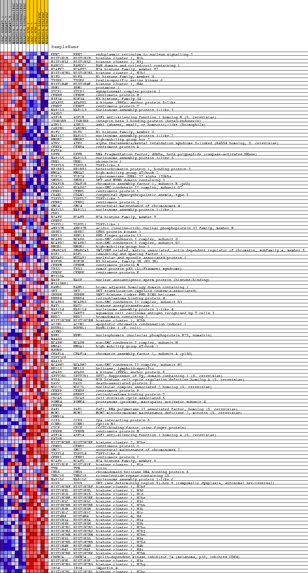 | 127 | HIST1H3A | HIST1H3A Entrez,  Source | histone cluster 1, H3a | 19137 | -0.996 | -0.5039 | Yes |