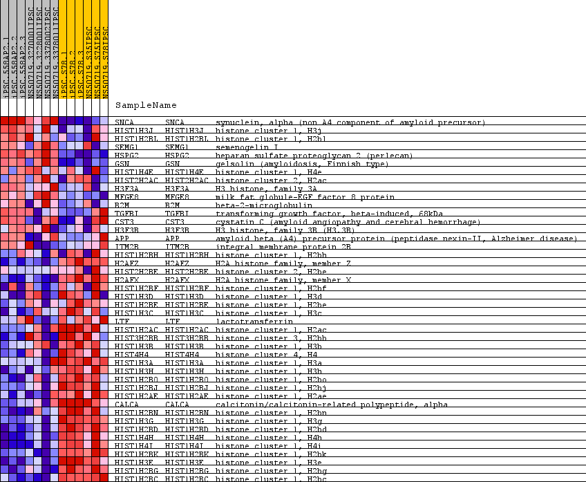| 36 | HIST1H2BN | HIST1H2BN Entrez,  Source | histone cluster 1, H2bn | 19368 | -1.195 | -0.4310 | Yes |