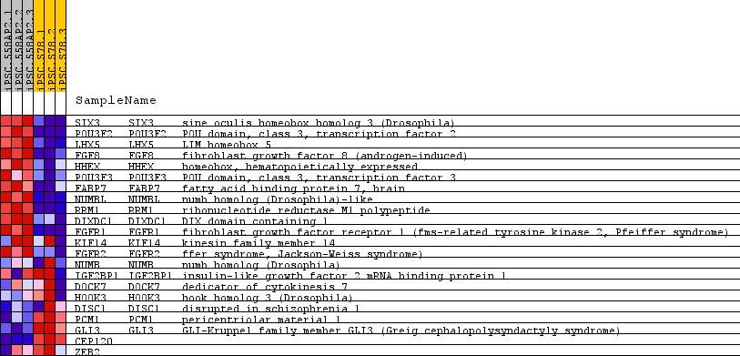 | 1 | SIX3 | SIX3 Entrez,  Source | sine oculis homeobox homolog 3 (Drosophila) | 30 | 4.728 | 0.2388 | Yes |