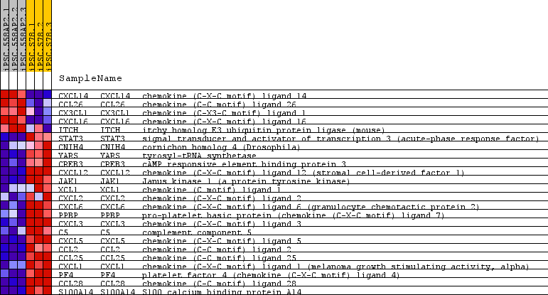 | 22 | PF4 | PF4 Entrez,  Source | platelet factor 4 (chemokine (C-X-C motif) ligand 4) | 20593 | -2.918 | -0.1872 | Yes |