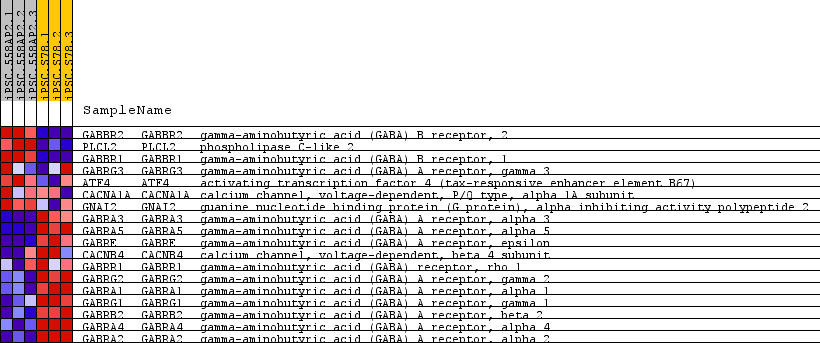 | 14 | GABRA1 | GABRA1 Entrez,  Source | gamma-aminobutyric acid (GABA) A receptor, alpha 1 | 20590 | -2.905 | -0.6371 | Yes |