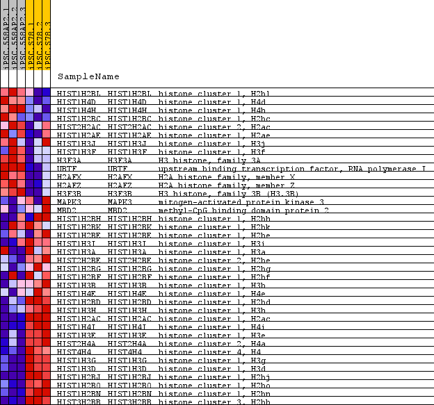 | 26 | HIST1H2BD | HIST1H2BD Entrez,  Source | histone cluster 1, H2bd | 18676 | -0.971 | -0.6507 | Yes |