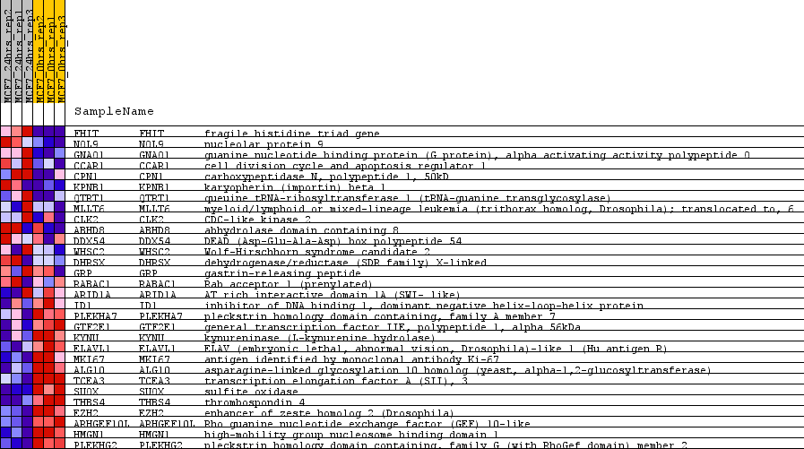 | 1 | FHIT | FHIT Entrez,  Source | fragile histidine triad gene | 3210 | 1.503 | -0.1906 | No |
